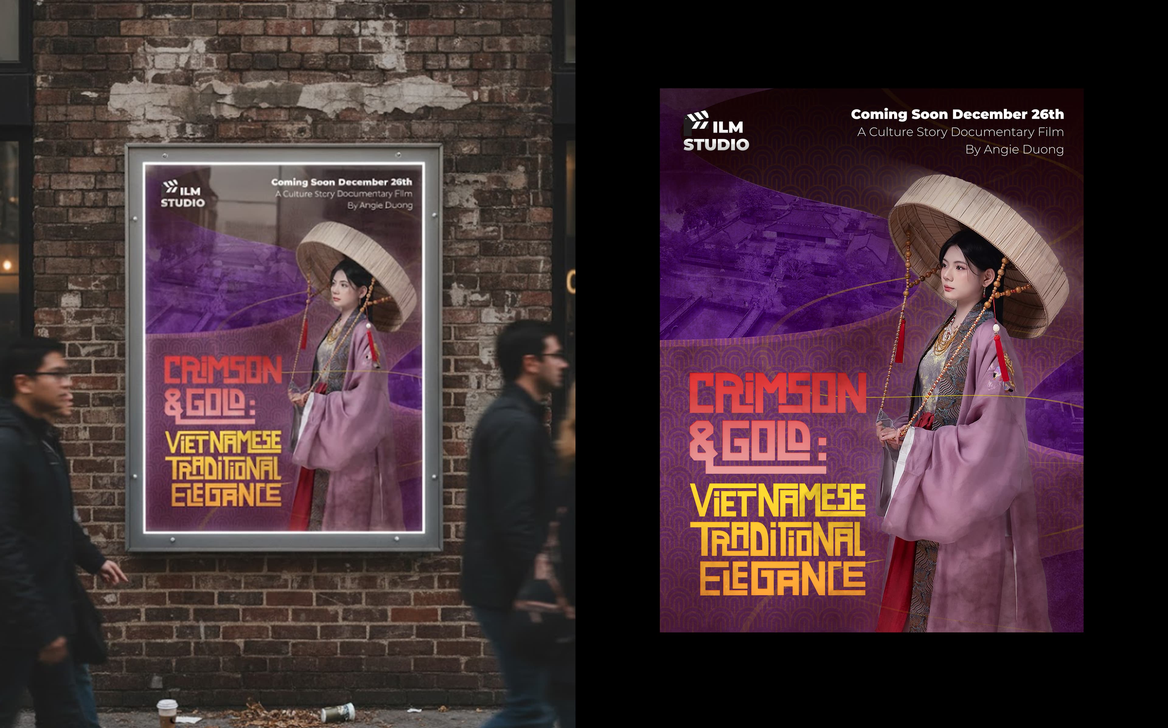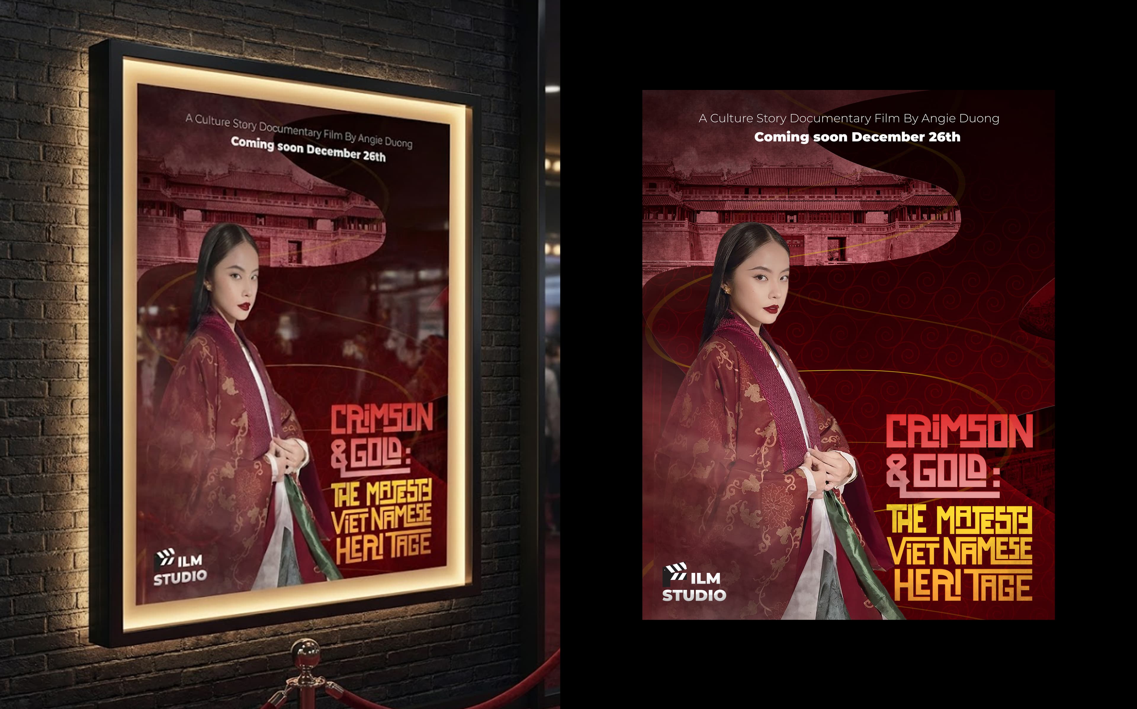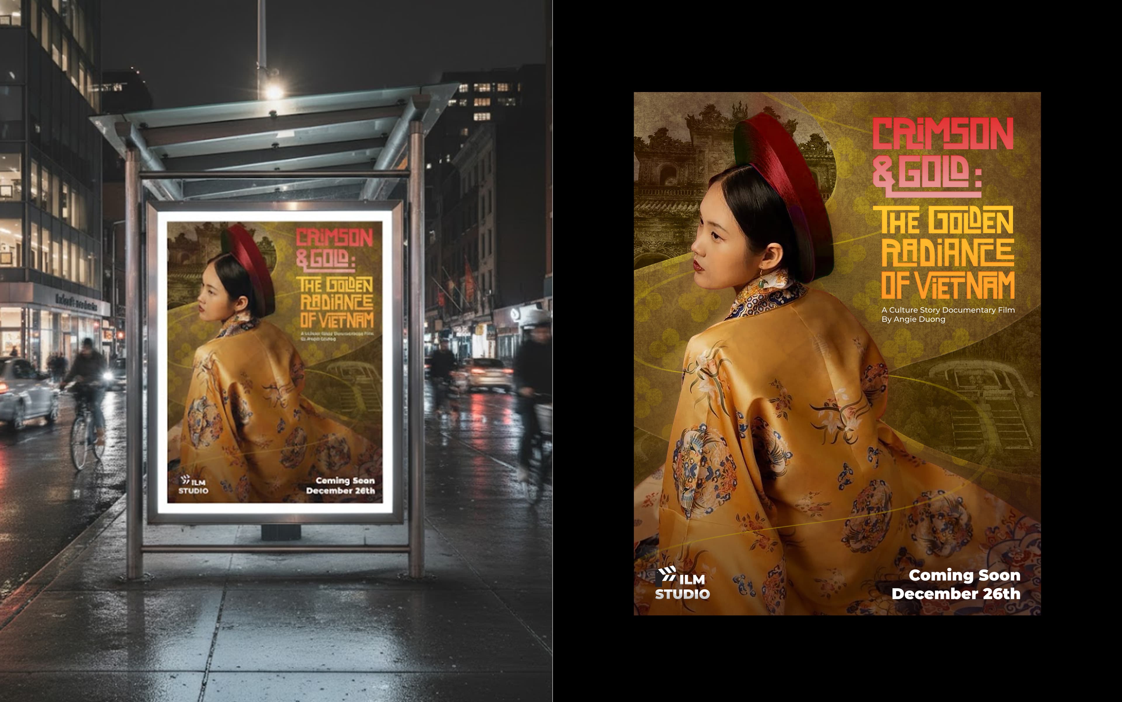 “Crimson & Gold” is a personal passion project: a series of documentary posters I created to showcase the elegance and diversity of Vietnam’s royal attire from Huế. More than just promoting a film, these posters are a visual love letter to my heritage. The goal was to show the world that Vietnamese attire is not just the modern áo dài, but includes many other beautiful, elegant, and historically rich styles from the old royal courts of Huế. Each poster highlights a different color theme and a unique costume detail, set against the iconic backdrop of the Imperial City and other historic sites. I designed the typography to feel like it came from old history books and classic Vietnamese publications, creating a look that feels both timeless and distinctly Vietnamese. Through this work, I wanted to share my deep pride in our country’s history, beauty, and cultural identity with a global audience.